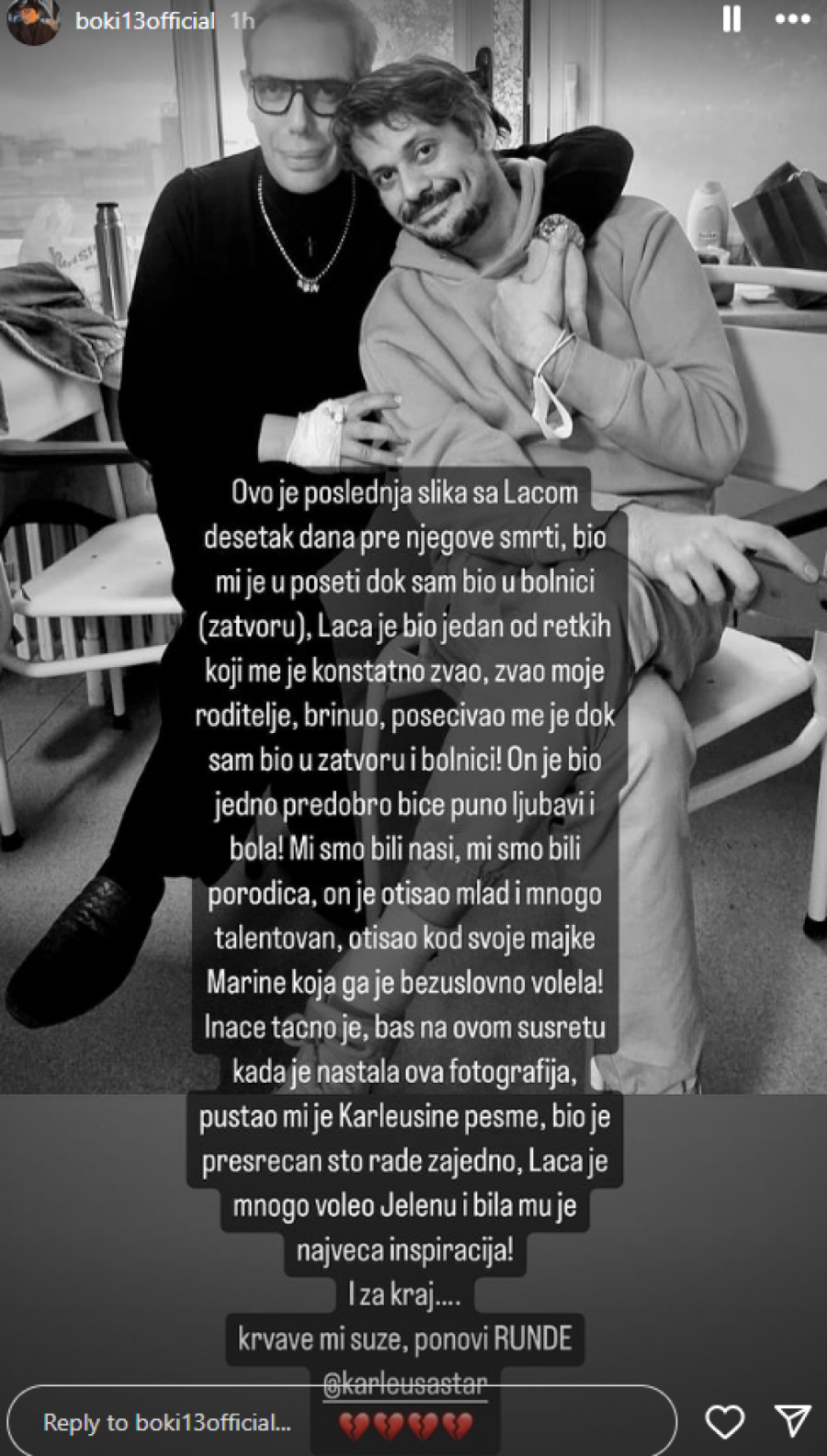 – Ovo je poslednja slika sa Laćom desetak dana pre njegove smrti, bio mi je u poseti dok sam bio u bolnici (zatvoru), Laća je bio jedan od retkih koji me je konstantno zvao, zvao moje roditelje, brinuo, posećivao me je dok sam bio u zatvoru i bolnici! On je bio jedno predobro biće puno ljubavi i bola! Mi smo bili naši, mi smo bili porodica, on je otišao mlad i mnogo talentovan, otišao kod svoje majke Marine koja ga je bezuslovno volela! Inače, tačno je, baš na ovom susretu kada je nastala ova fotografija, puštao mi je Karleušine pesme, bio je presrećan što rade zajedno. Laća je mnogo voleo Jelenu i bila mu je najveća inspiracija! I za kraj… Krvave mi suze, ponovi runde – napisao je Boki 13 i u objavi označio Jelenu Karleušu i dodao emodžije slomljenog srca.
