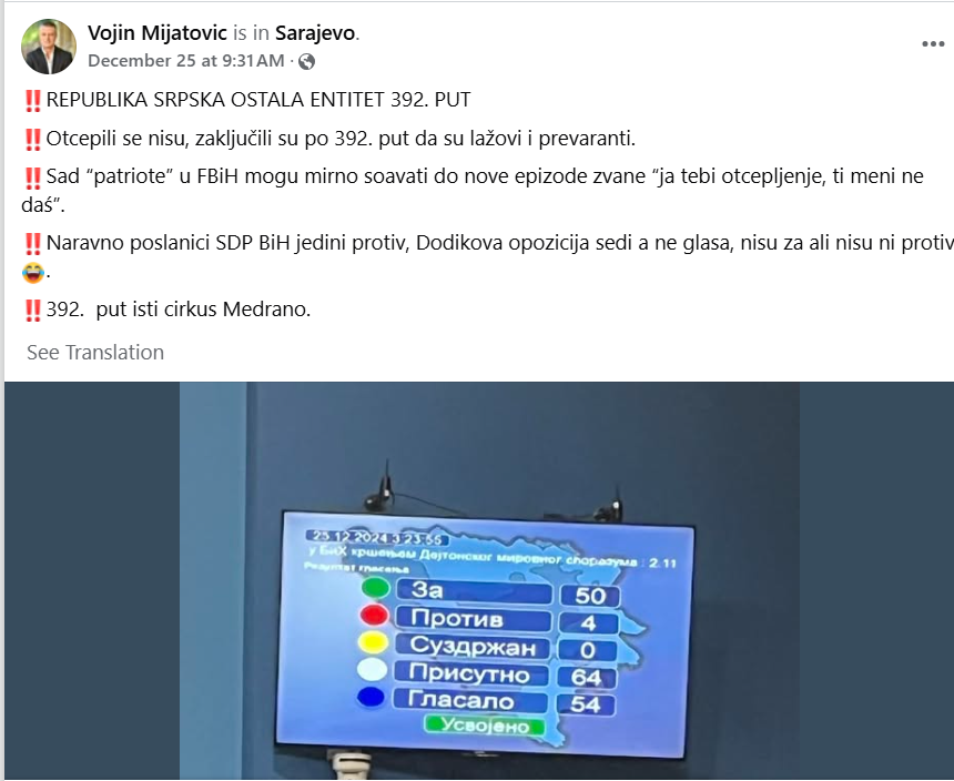Zamjenik premijera FBiH i federalni ministar, te potpredsjednik SDP-a Vojin Mijatović oglasio se na svom Facebook profilu povodom posebne sjednice Narodne skupštine RS.