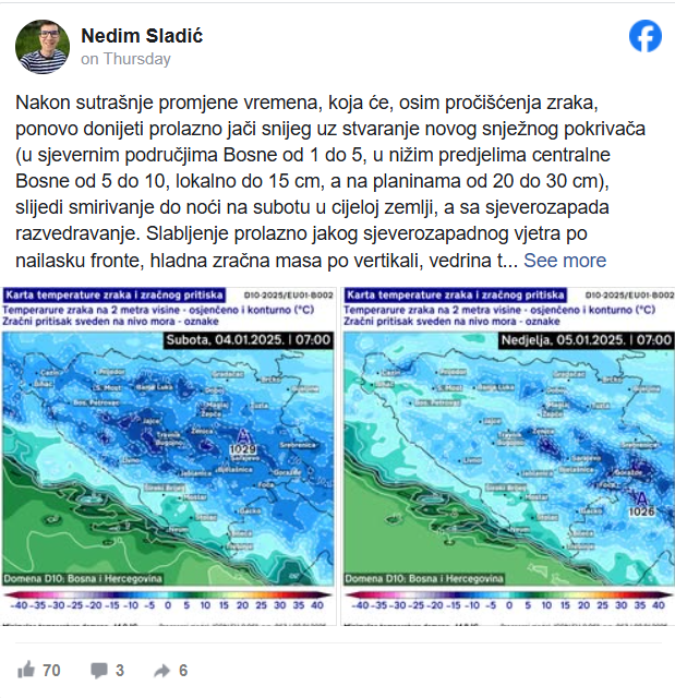A nakon današnje promjene vremena, koja će, osim pročišćenja zraka, ponovo donijeti prolazno jači snijeg uz stvaranje novog snježnog pokrivača (u sjevernim područjima Bosne od 1 do 5, u nižim predjelima centralne Bosne od 5 do 10, lokalno do 15 cm, a na planinama od 20 do 30 cm), slijedi smirivanje do noći na subotu u cijeloj zemlji, najavio je Sladić.