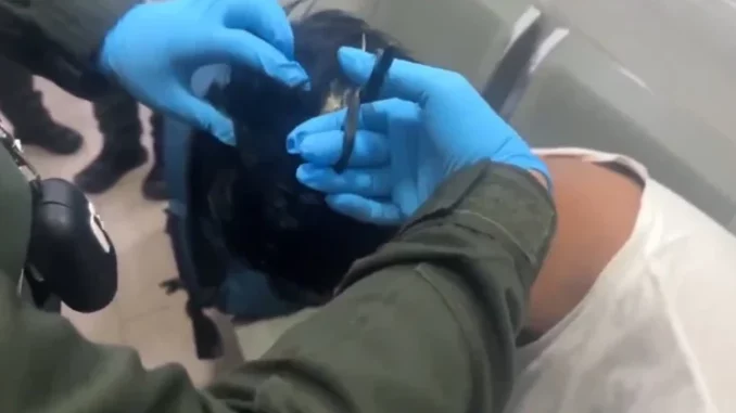 Video snimak hapšenja pokazuje policajce kako režu periku s glave, s nekoliko malih paketa kokaina koji se vide pričvršćeni na unutrašnjoj strani perike.
