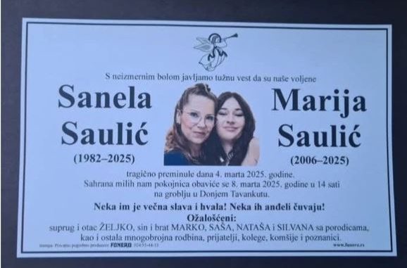 Danas je u Donjem Tavankutu (Srbija) sahranjena Sanela S. (45) sa kćerkom Marijom S. (18), koje su poginule u nesreći koja se dogodila 4. marta u mjestu Mala Bosna kod Subotice. One su izgorjele zajedno u automobilu koji se zapalio nakon saobraćajne nesreće koju je izazvao vozač drugog automobila.