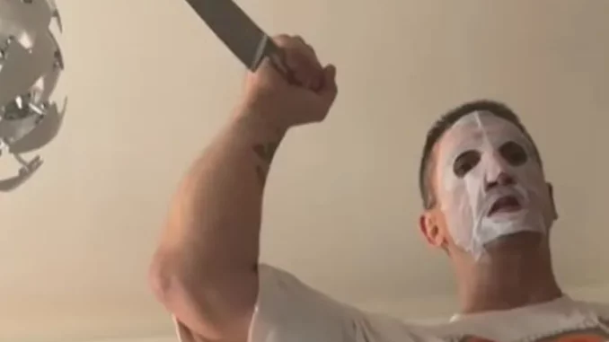 Naime, ona ga je usnimila dok po kući hoda s maskom na slicu, onom za ulepšavanje kože, ali i velikim kuhinjskim nožem.