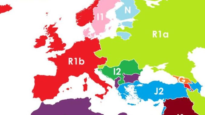 Mapa koju vidite pokazuje kako bi granice izgledale da su iscrtane na osnovu DNK, odnosno dominatne Y-DNK haplogrupe (umjesto po nacionalnom ključu).