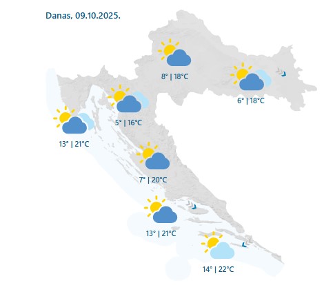 Danas će biti promjenljivo oblačno, prijepodne uz mjestimična sunčana razdoblja, a uglavnom od sredine dana u unutrašnjosti i na sjevernom Jadranu ponegdje će pasti malo kiše ili lokalni pljusak. U Dalmaciji sunčanije, osobito na jugu. Vjetar slab, na istoku do umjeren sjeverozapadni. Na Jadranu slaba do umjerena bura, poslijepodne i sjeverozapadni i jugozapadni vjetar. Najviša temperatura zraka uglavnom od 17 do 22 °C, prognoza je DHMZ-a.