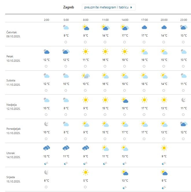 Dani vikenda uglavnom će proteći bez padalina, uz pretežno sunčano vrijeme. I ponedjeljak tijekom dana još uglavnom sunčan, no poslijepodne će stići pogoršanje s kišom i pljuskovima. Na 7-dnevnim kartama koje je na svojim stranicama objavio DHMZ, može se vidjeti da će u Zagrebu u ponedjeljak dnevna temperatura pasti, a u utorak će biti još i niža, uz naoblaku i kišu.